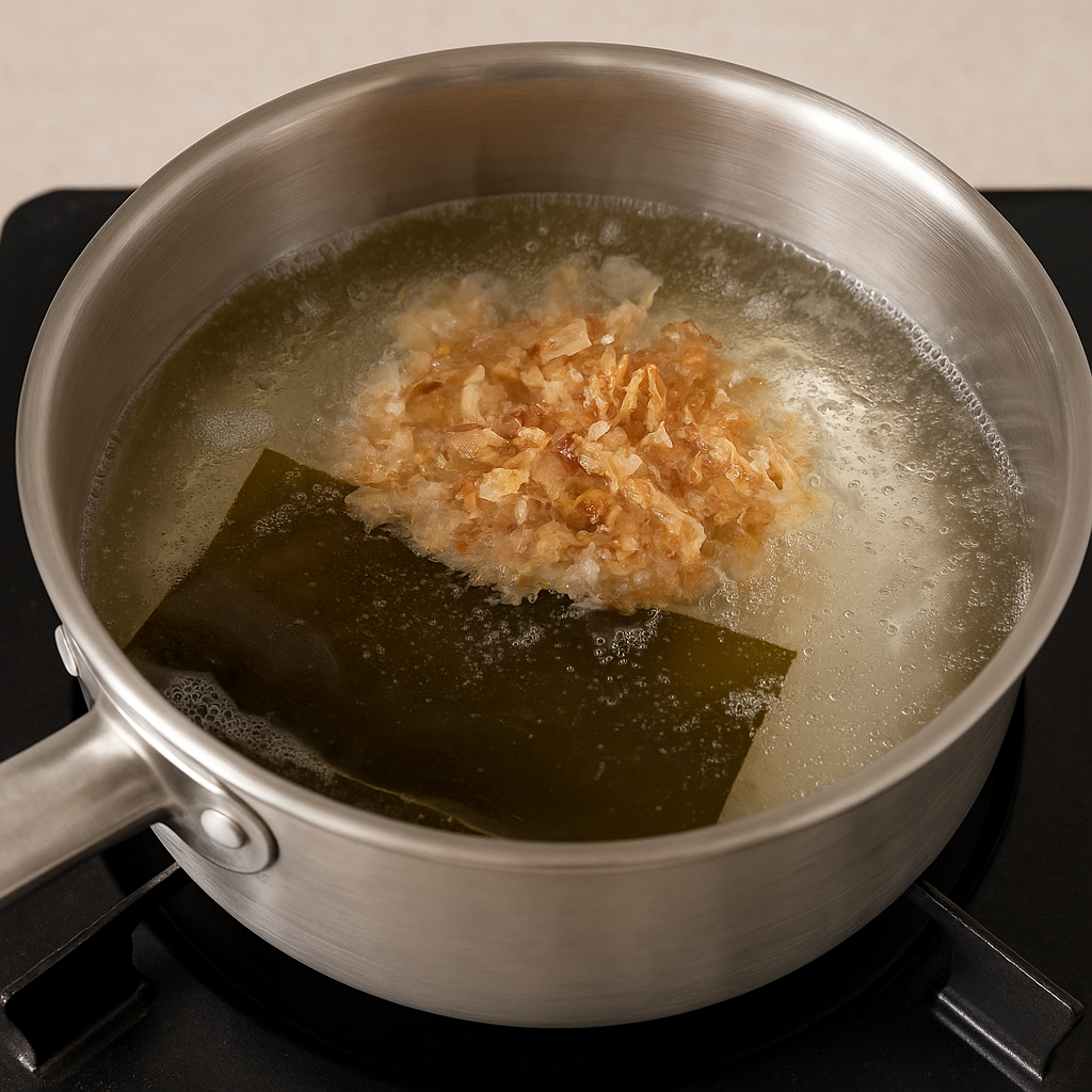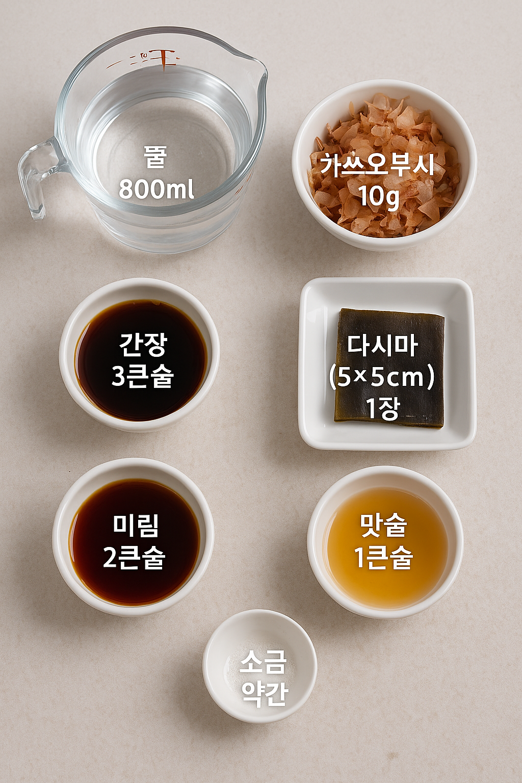 가쓰오부시 육수에 간장과 미림으로 간을 맞춘 전통 방식으로, 간단하면서도 정통에 가까운 맛을 낼 수 있습니다.