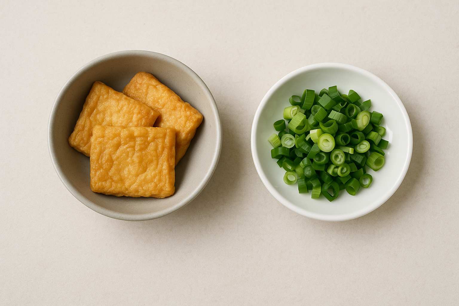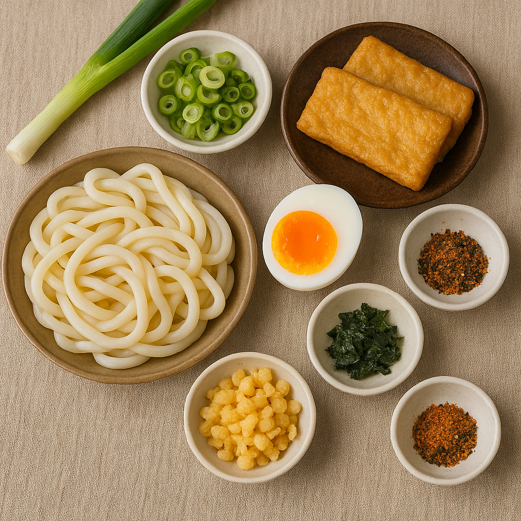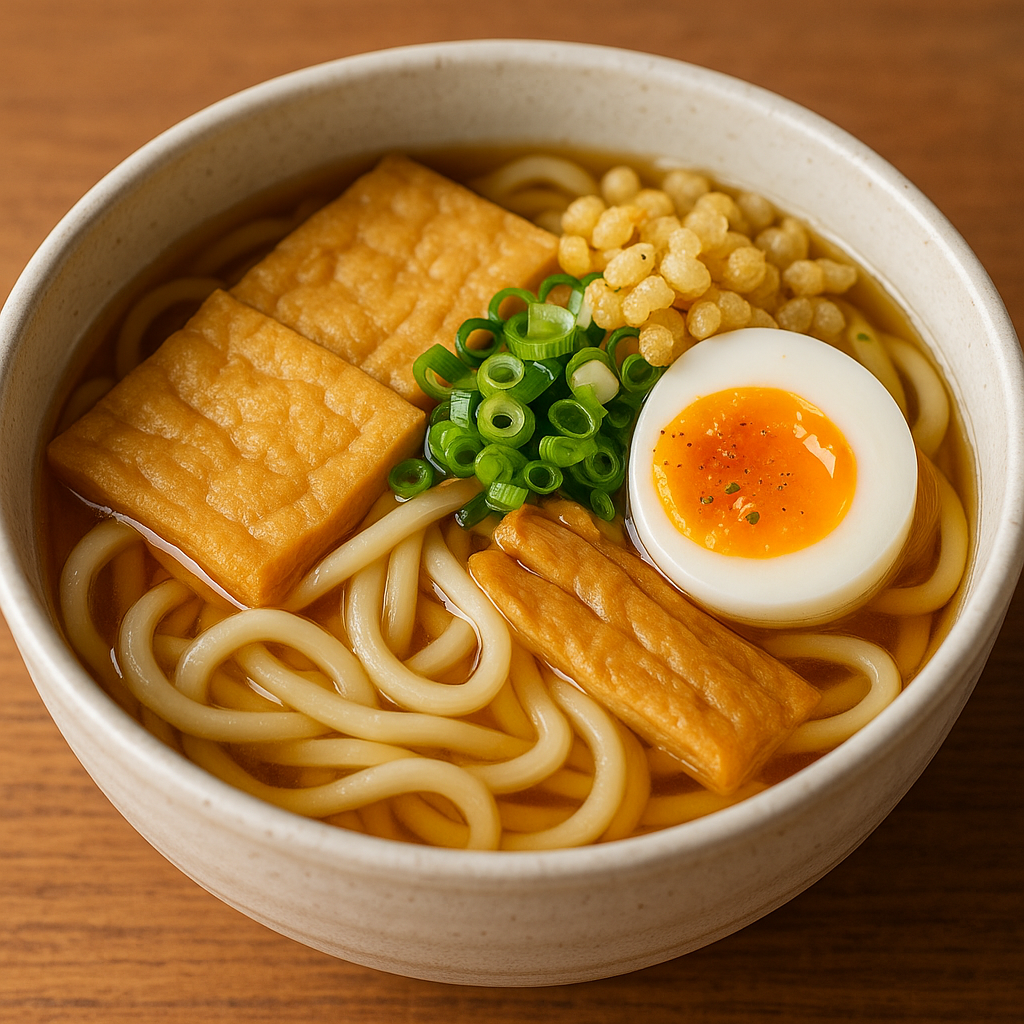 그릇에 면을 담고 국물을 붓고, 유부, 파, 계란, 덴까스 등을 얹어 마무리합니다.