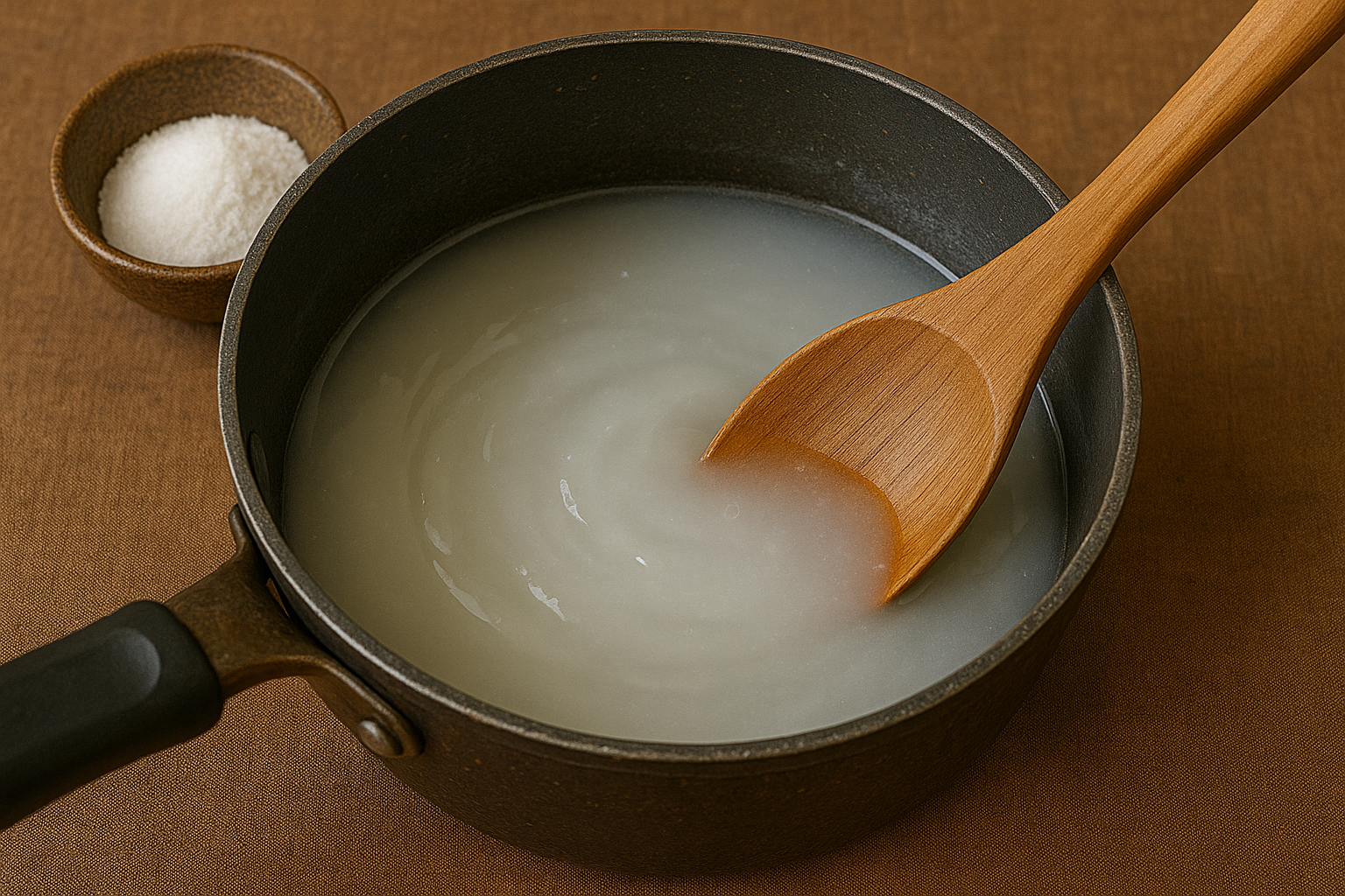 → 찹쌀가루와 물을 냄비에 넣고 약불에서 저어가며 끓여 풀을 만듭니다.